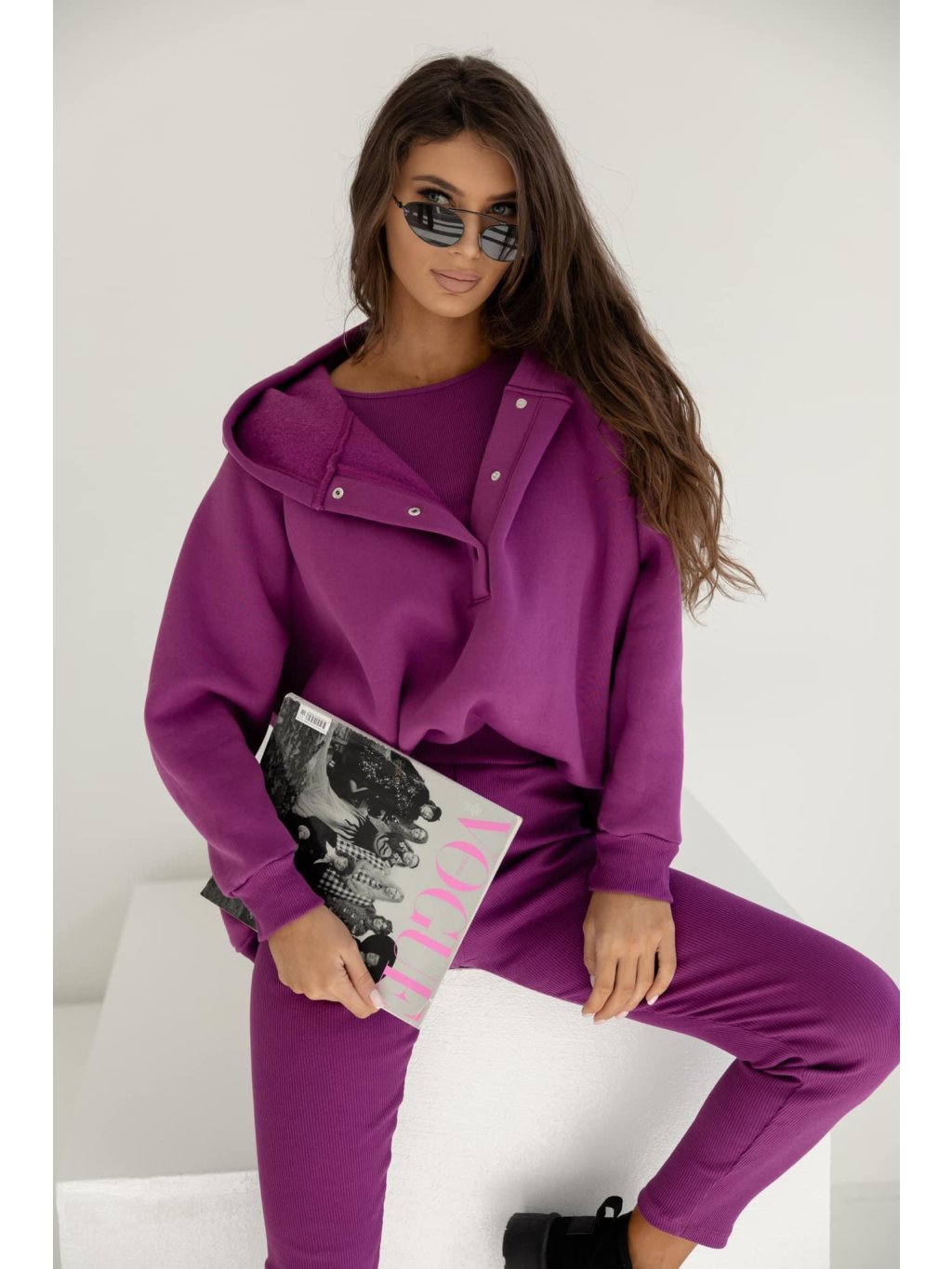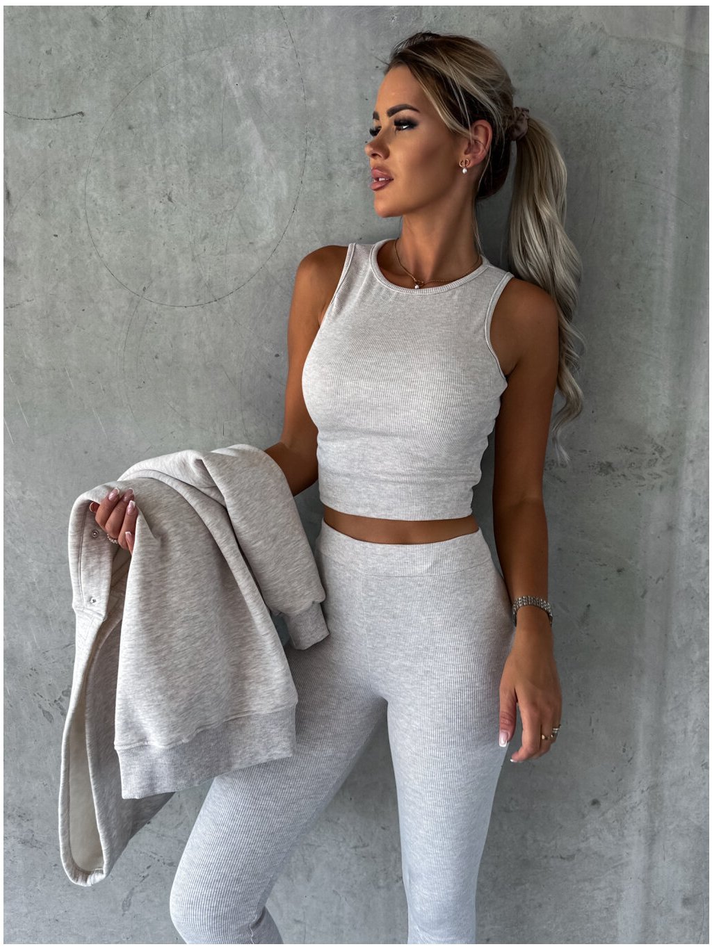 Sada Sweetly Gently 3v1 melange beige se skládá z mikiny, topu a legín s žebrovanou úpravou. Tento model bude perfektní pro každodenní použití díky tomu, že je vyroben z příjemné a pohodlné látky. Noste společně nebo samostatně.