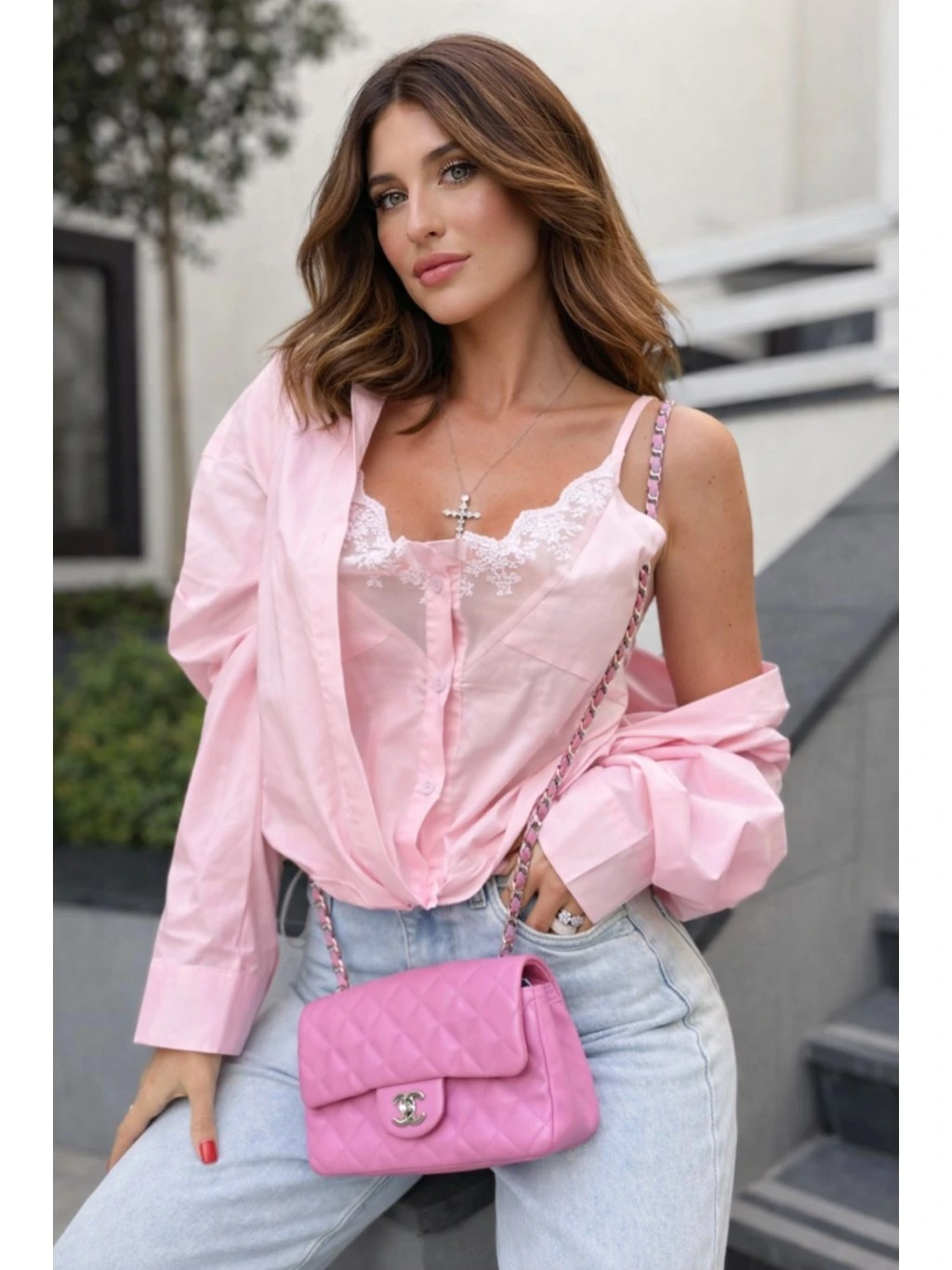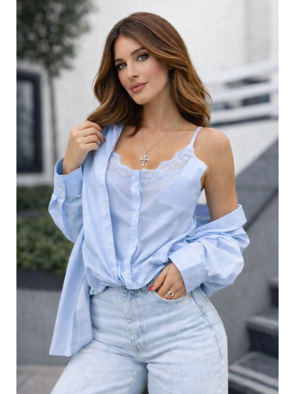 Stylový kousek, který kombinuje lehkost košile a ženský detail krajkového topu v jednom. Ideální volba pro každodenní outfit i elegantnější příležitosti. Volnější střih zajišťuje pohodlí, zatímco jemná krajka dodává outfitu sofistikovaný nádech.