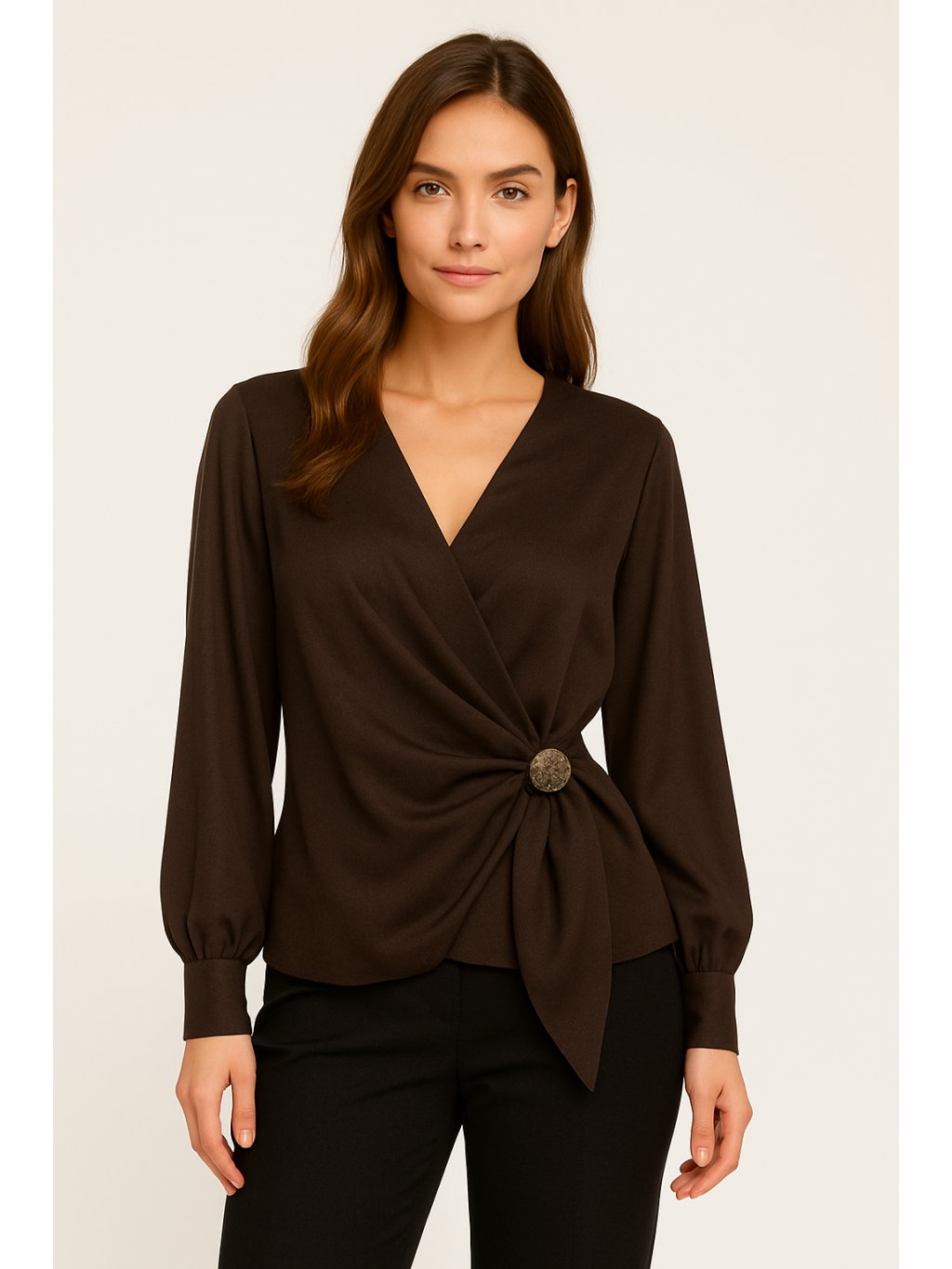 Dominantou je originální řasený uzel s dekorativní broží, který dodává halence jedinečný a sofistikovaný vzhled.