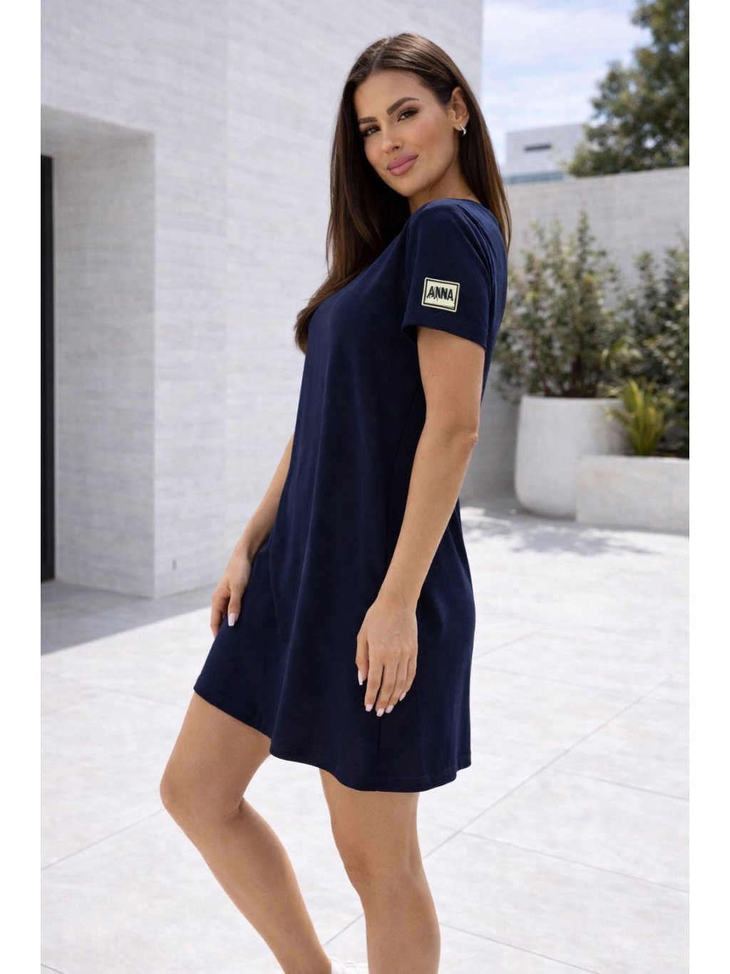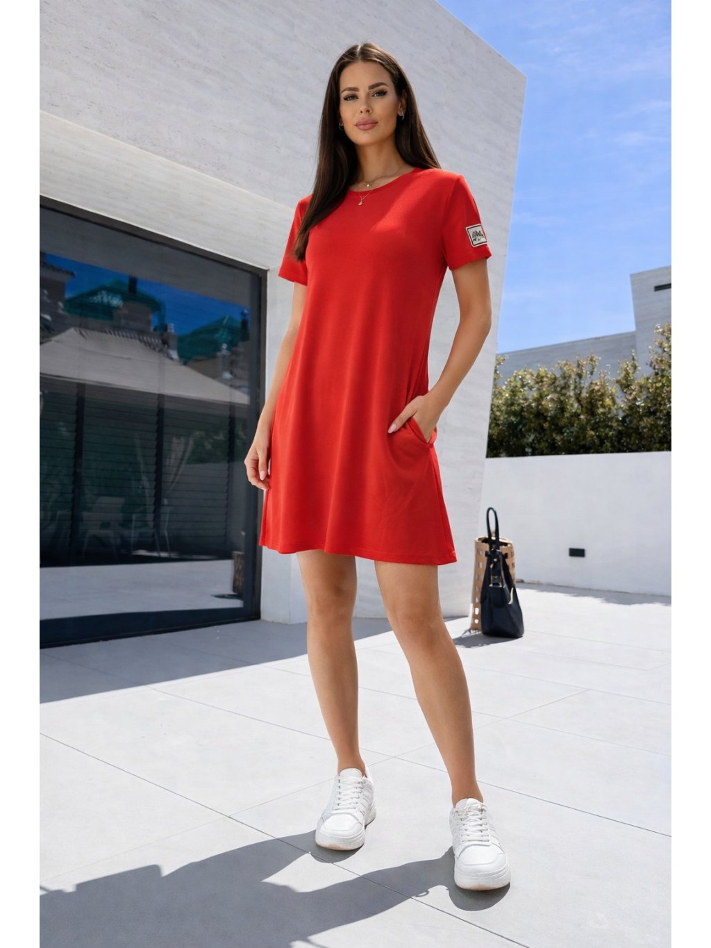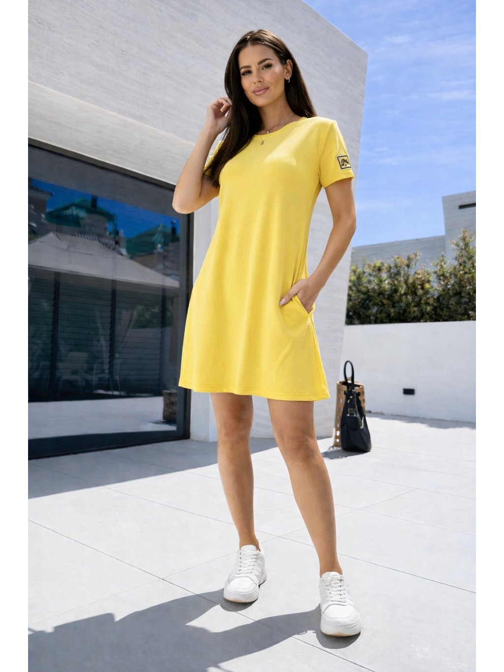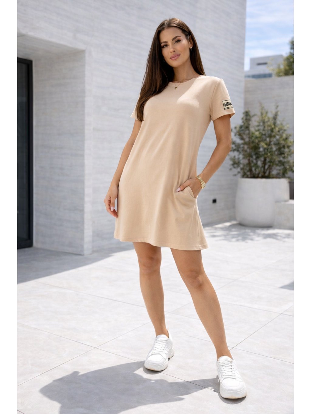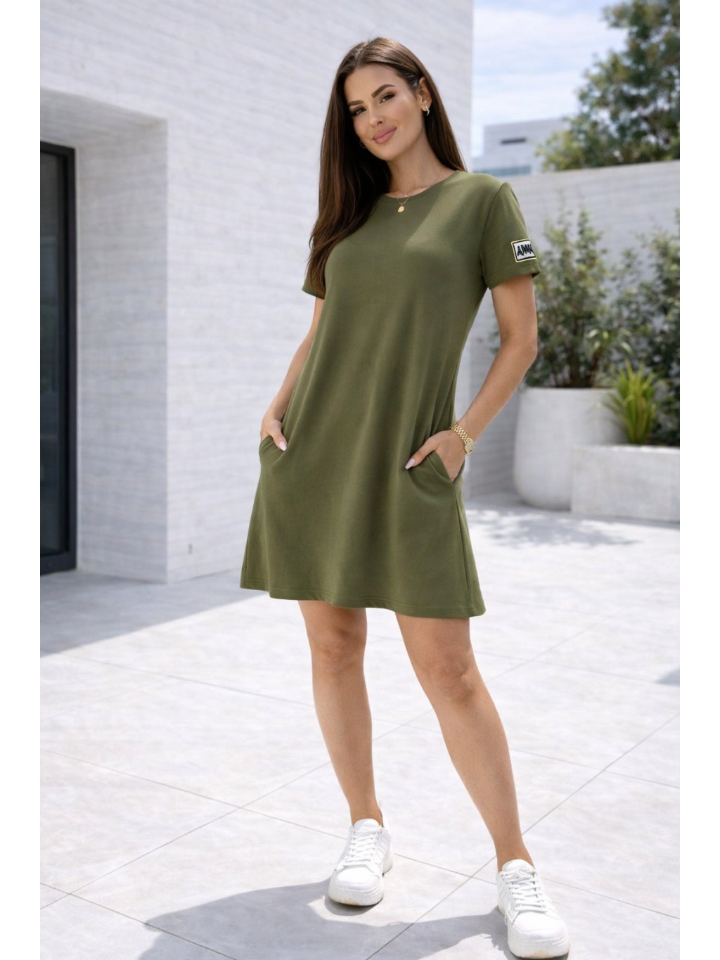 Šaty mají volnější střih, který krásně sedí na různých typech postavy a zároveň poskytuje maximální komfort při nošení. Krátký rukáv, kulatý výstřih a délka nad kolena vytváří moderní a nadčasový vzhled. Praktické kapsy na bocích dodávají šatům nejen styl, ale i funkčnost.