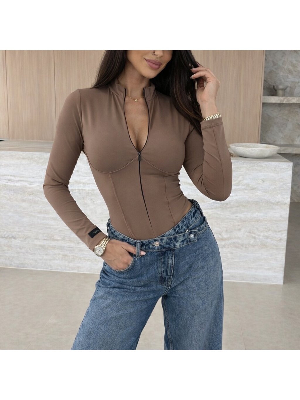 Stylové dámské body, které dokonale zvýrazní postavu. Přiléhavý střih s tvarujícími švy krásně kopíruje siluetu a přední zip umožňuje nastavit hloubku výstřihu podle nálady či příležitosti. Body má dlouhý rukáv a příjemný elastický materiál, který je pohodlný na celodenní nošení.
