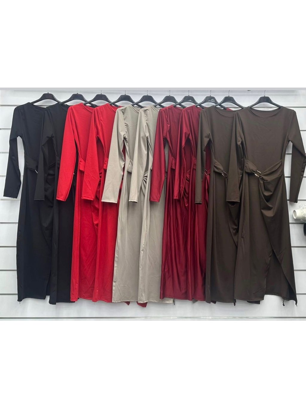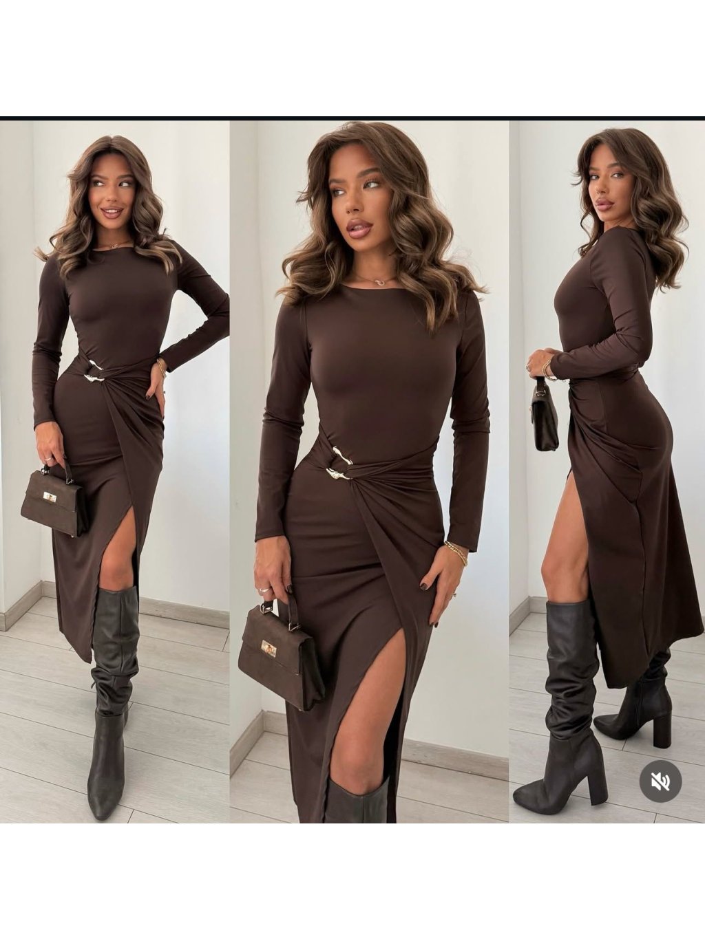 Dámské elegantní šaty s dlouhým rukávem, které krásně zvýrazní siluetu a dodají šmrnc každému outfitu. Šaty mají výrazný asymetrický rozparek na jedné straně a dekorativní řasení v pase, zajištěné kovovou sponou pro luxusní vzhled.