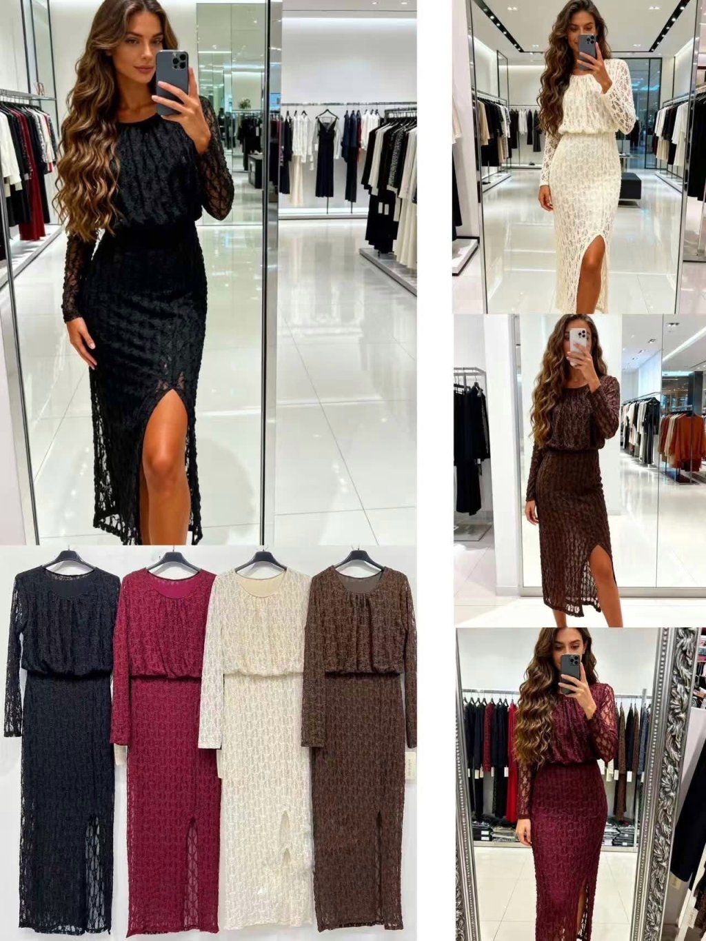 Luxusní krajkové maxi šaty, které dodají každému outfitu nádech ženskosti a sebevědomí. Díky jemné krajce, dlouhým rukávům a efektnímu rozparku působí šaty atraktivně, ale stále vkusně. Volnější vršek a přiléhavá sukně vytvářejí krásnou siluetu a sluší všem typům postavy.