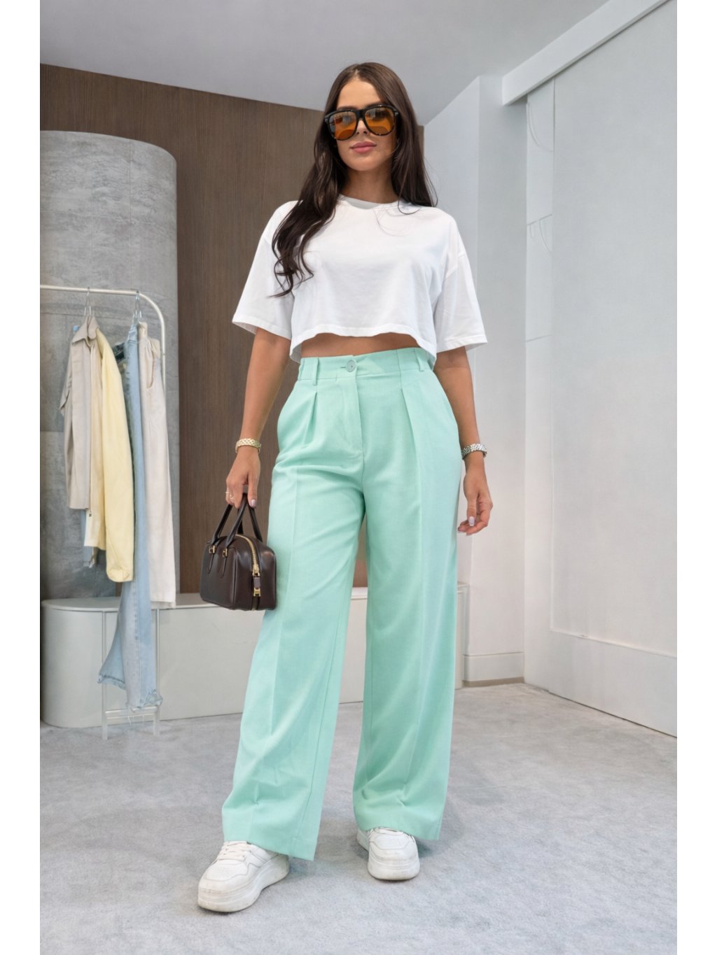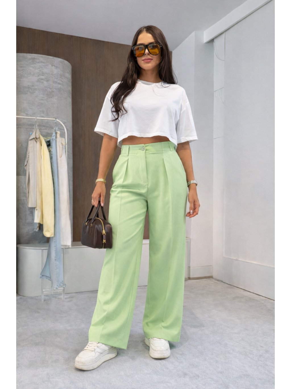 Elegantní kalhoty s vysokým pasem a širokými nohavicemi, které krásně prodlouží siluetu. Díky lehkému a příjemnému materiálu jsou ideální na každodenní nošení i elegantnější outfit. Kalhoty mají zapínání na knoflík a zip, poutka na pásek a puky na nohavicích, které dodávají kalhotám upravený vzhled.