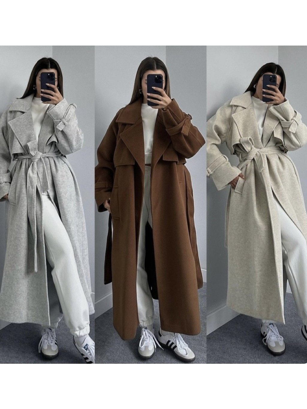 Stylový dlouhý kabát s volným střihem a výrazným límcem, ideální pro chladné dny. Díky pásku v pase si snadno přizpůsobíte siluetu a vytvoříte elegantní, ale zároveň ležérní look. Praktické kapsy a široké manžety dodávají kabátu moderní nádech. Perfektní v kombinaci s džínami, tepláky i elegantními kalhotami.