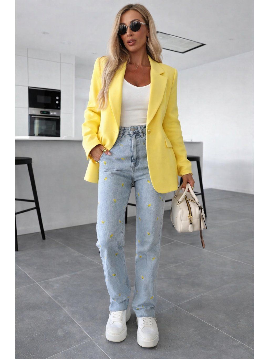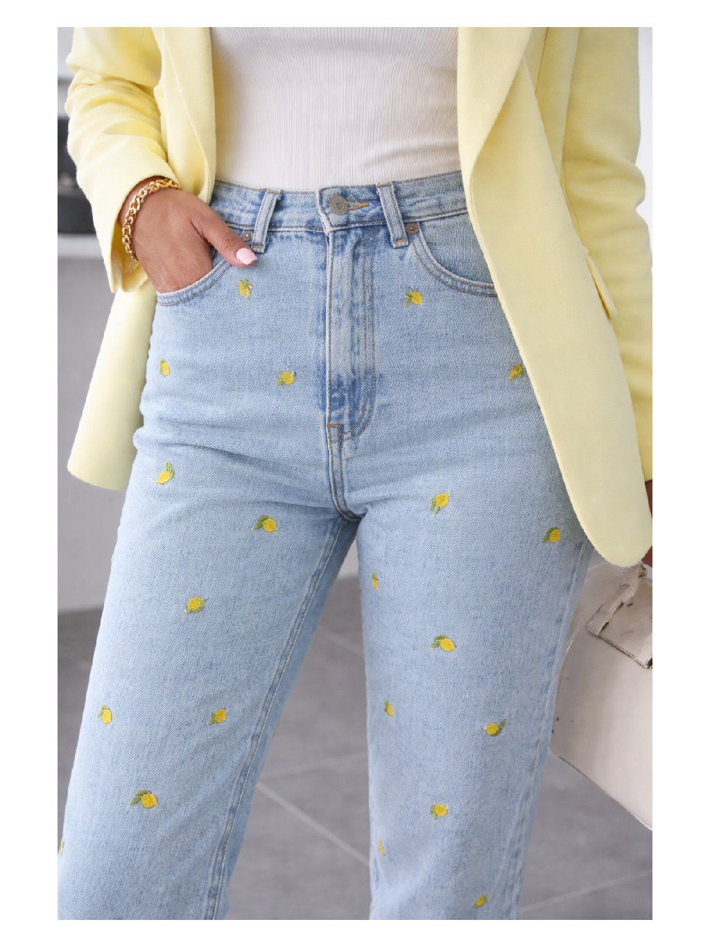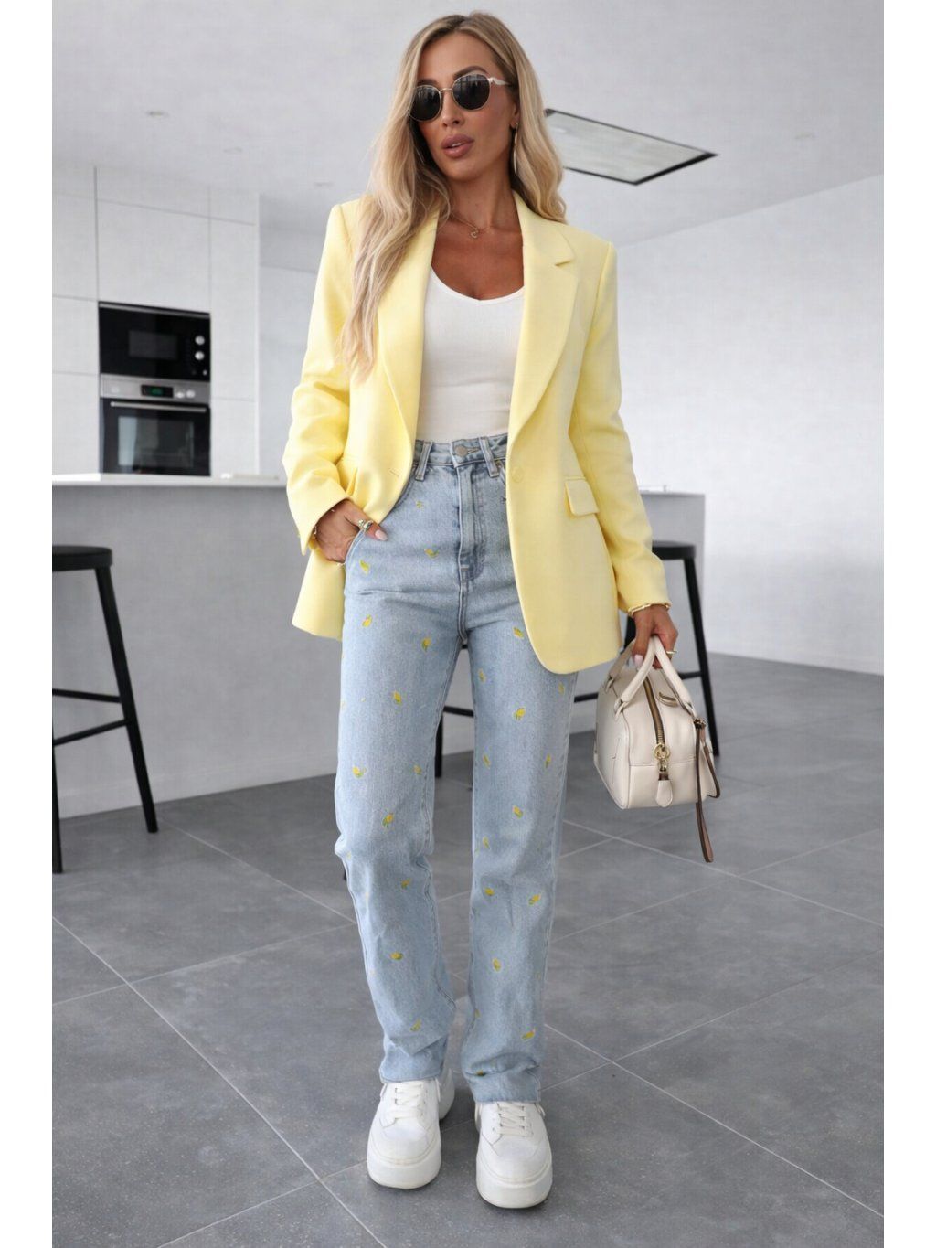 Stylový kousek, který okamžitě rozzáří každý outfit. Tyto světle modré džíny s jemnou výšivkou citronků kombinují ležérní denim look s hravým detailem, který zaujme na první pohled. Skvěle se hodí jak k basic topu, tak i k výraznějším kouskům – přesně jako na fotce s pastelovým sakem.