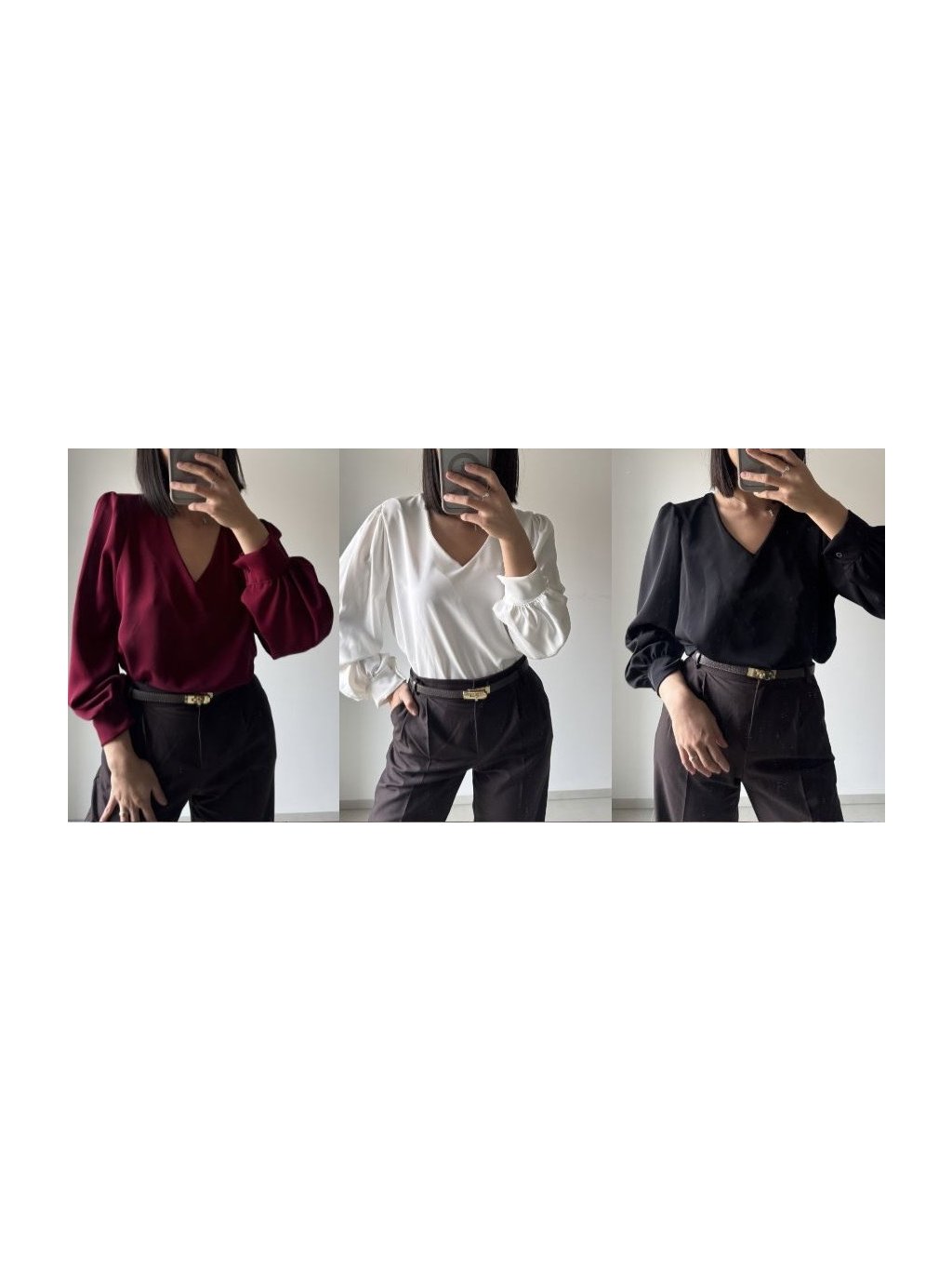 Elegantní dámská halenka s výrazným ženským střihem a jemně nabíranými rukávy. Materiál je lehký, hladký a příjemný na dotek, ideální pro každodenní nošení i formálnější příležitosti. Výstřih do V působí opticky prodlužujícím dojmem, zatímco balónové rukávy dodávají outfitu sofistikovaný vzhled.