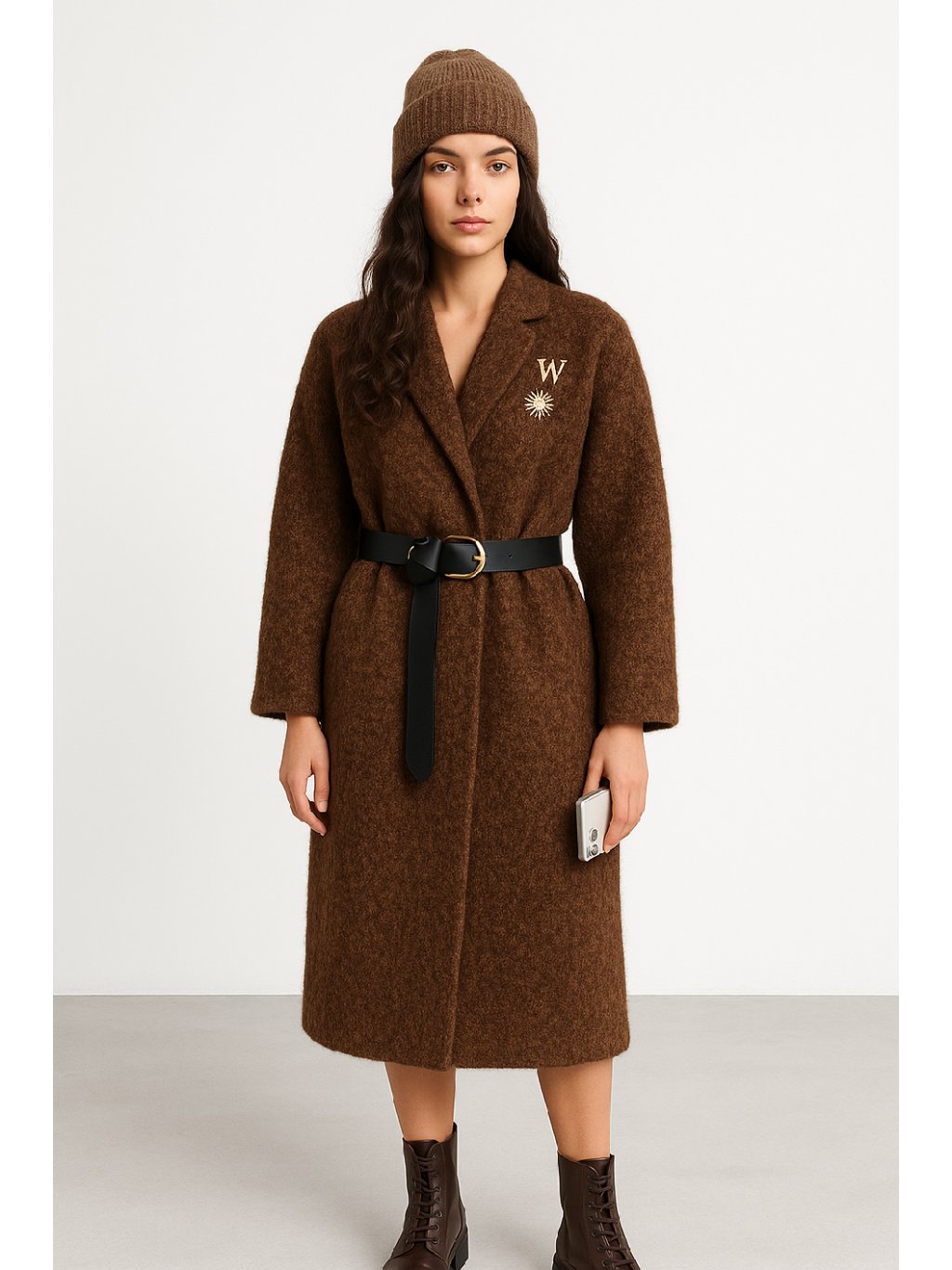 Stylový kabát, který spojuje eleganci, pohodlí a funkčnost. Vyrobený z měkké směsi s vysokým podílem vlny, skvěle zahřeje a přitom působí lehce a nadčasově. Součástí je černý pásek s kovovou sponou a zlatá brož s iniciálou W a motivem květu, které dodávají kabátu originální vzhled.