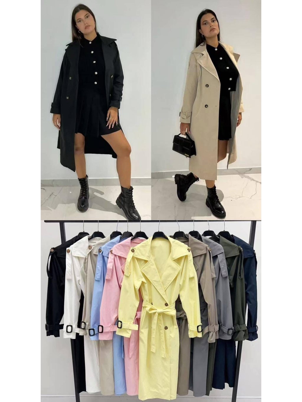 Stylový a nadčasový dámský trenčkot, který skvěle doplní každý outfit. Klasický střih s límcem, zapínání na knoflíky a pásek v pase umožňují přizpůsobení siluetě. Kabát je vhodný jak k elegantním šatům, tak i ke sportovnějším kombinacím s kozačkami nebo teniskami.