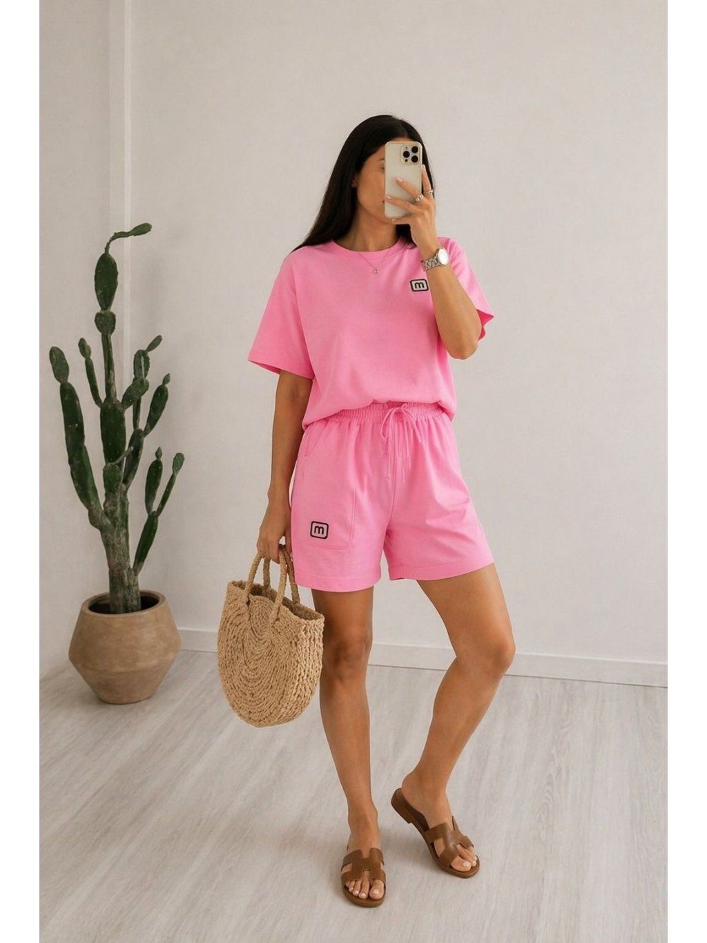 Oversize tričko v kombinaci s pohodlnými kraťasy na gumu vytváří moderní, uvolněný look. Skvěle se kombinuje s pantoflemi, teniskami i doplňky pro casual outfit.