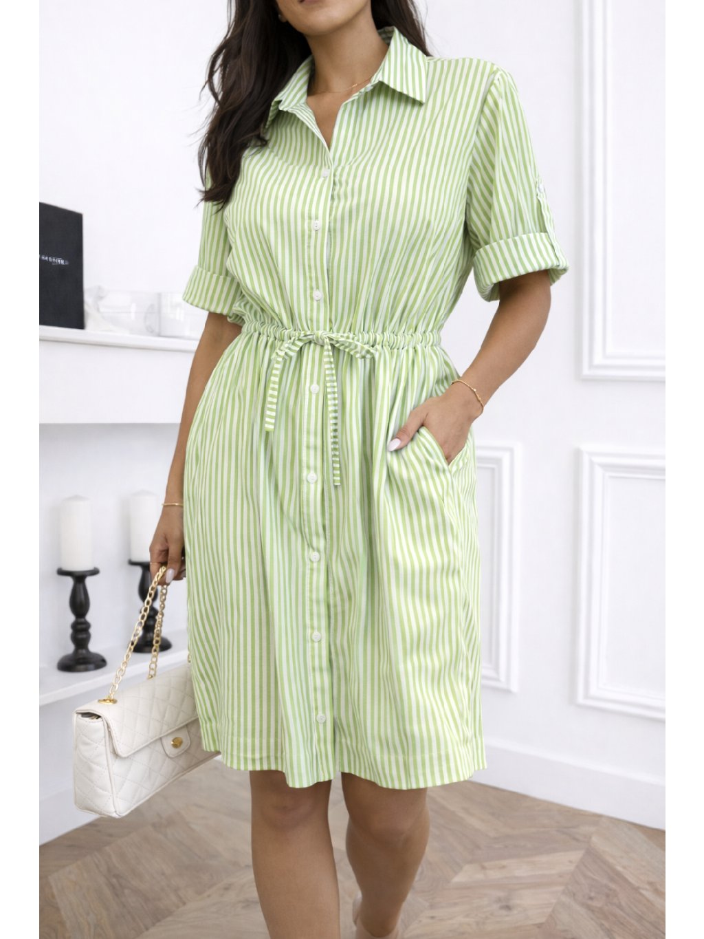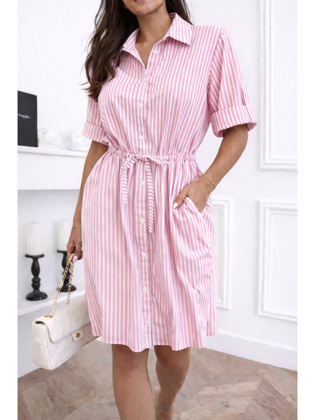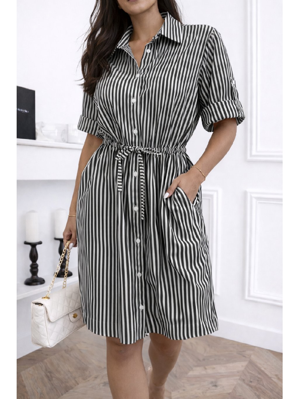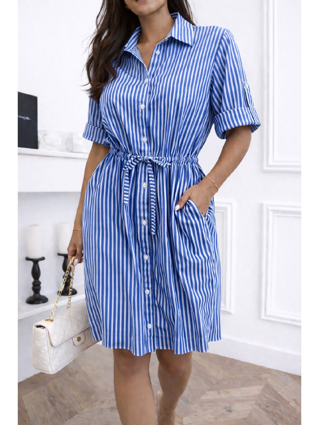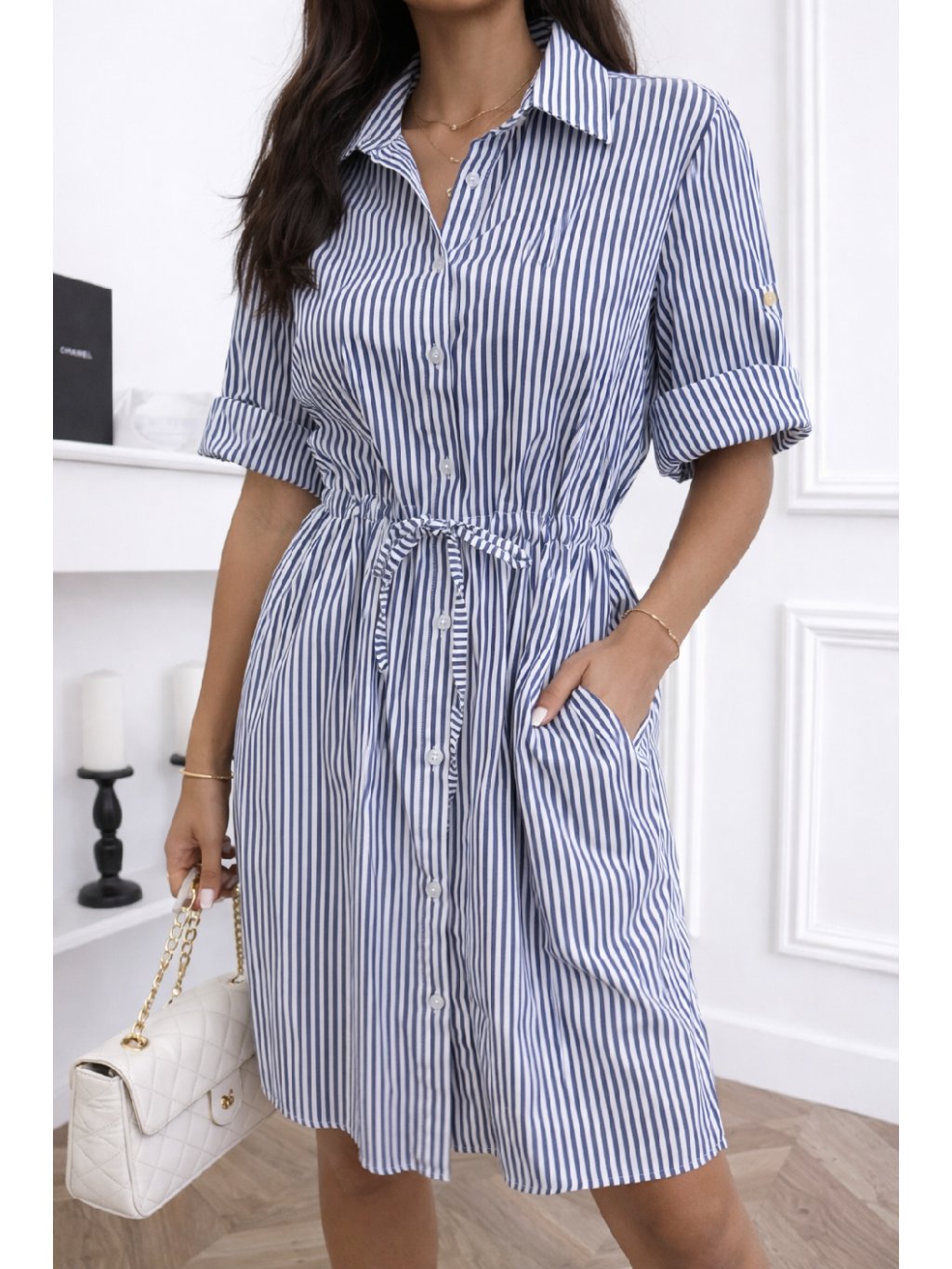 Stylové košilové šaty s jemnými pruhy jsou ideální volbou pro každodenní eleganci i letní pohodlí. Díky lehkému materiálu jsou velmi příjemné na nošení a krásně drží tvar. V pase mají praktickou šňůrku na stažení, díky které si můžete šaty upravit podle postavy a zvýraznit siluetu.