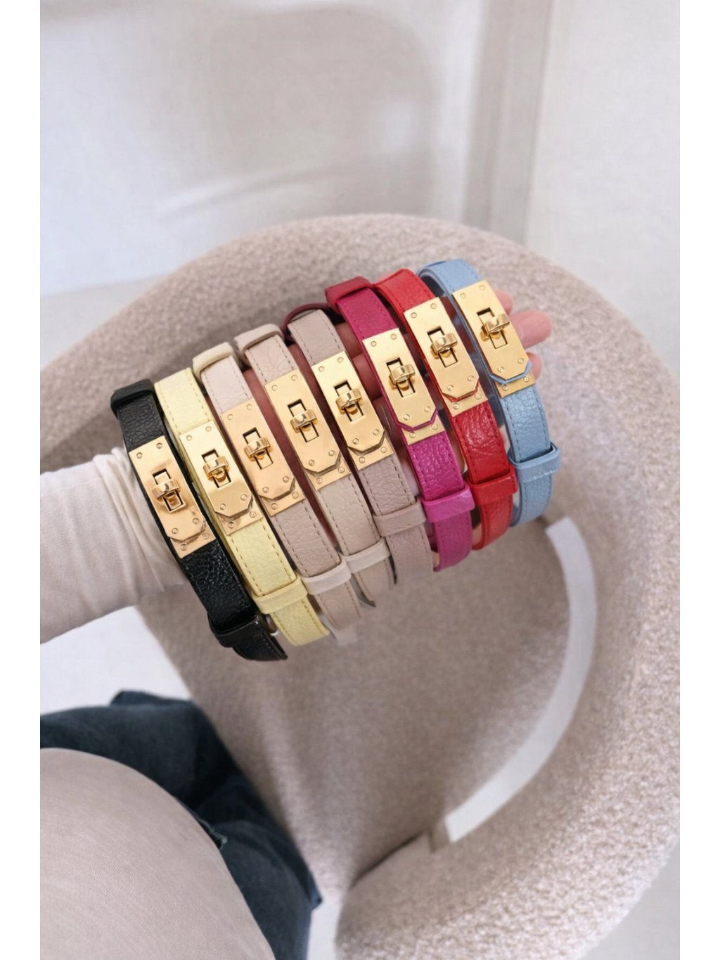 Elegantní pásek s výraznou zlatou sponou ve tvaru zámku, který pozvedne každý outfit. Vyrobený z kvalitní eko kůže s jemnou strukturou, je ideální doplněk jak k šatům, tak k saku či kabátu. Díky pevnému materiálu a preciznímu zpracování si zachovává tvar a dlouhou životnost.