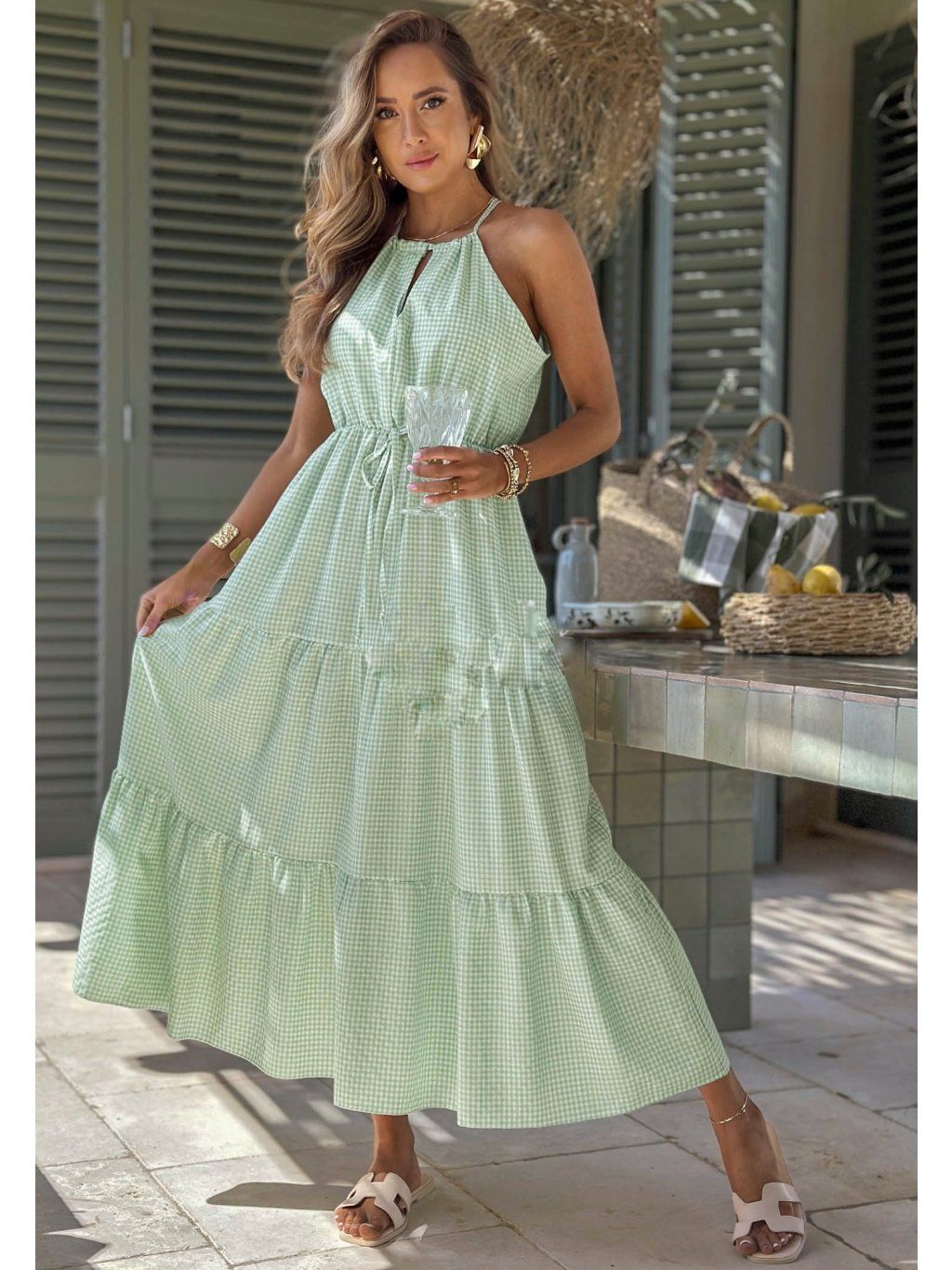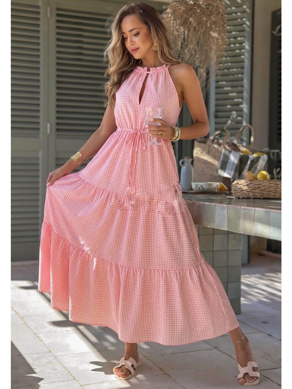 Lehké a vzdušné letní šaty v jemném růžovém kostkovaném vzoru (vichy), které působí svěže a velmi žensky. Šaty mají volnější střih s pružným pasem, který se přizpůsobí postavě a zároveň krásně zvýrazní siluetu. Horní část s jemným řasením a elegantním průstřihem u krku dodává modelu moderní nádech.