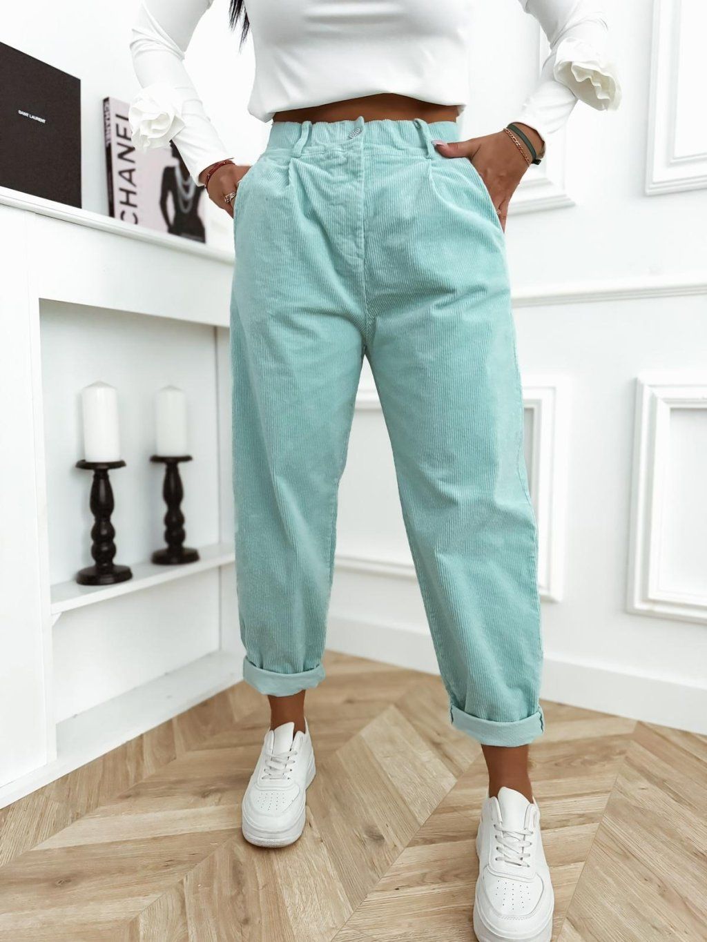 Stylové vysoké manšestráky, které spojují pohodlí a ženský detail. Jemný, měkký manšestr krásně drží tvar a zároveň je příjemný na nošení po celý den. Dominantou kalhot je originální knoflík ve tvaru srdíčka s jemným obrysem z perliček, který dodává modelu luxusní a hravý nádech.