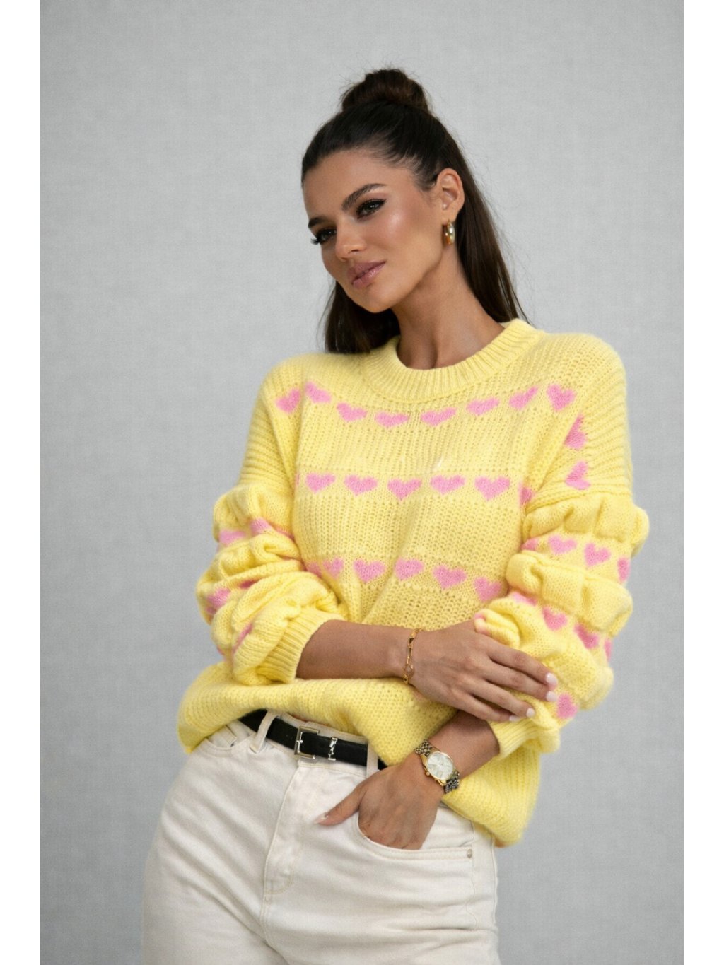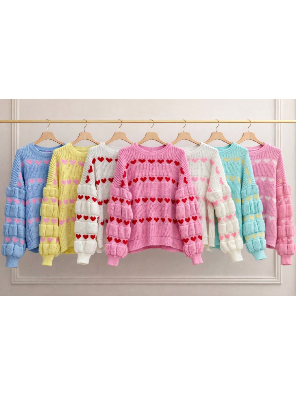 Romantický pletený svetr se vzorem srdíček, který okamžitě oživí každý outfit. Měkký a hřejivý materiál zajistí maximální komfort při nošení, zatímco nadýchané rukávy dodávají svetru moderní a ženský vzhled. Ideální volba k džínům, sukním i elegantním kalhotám – do města, na schůzku i na volný čas.