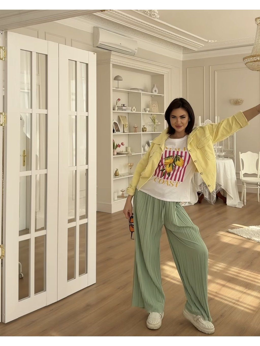 - styl: plisované široké kalhoty