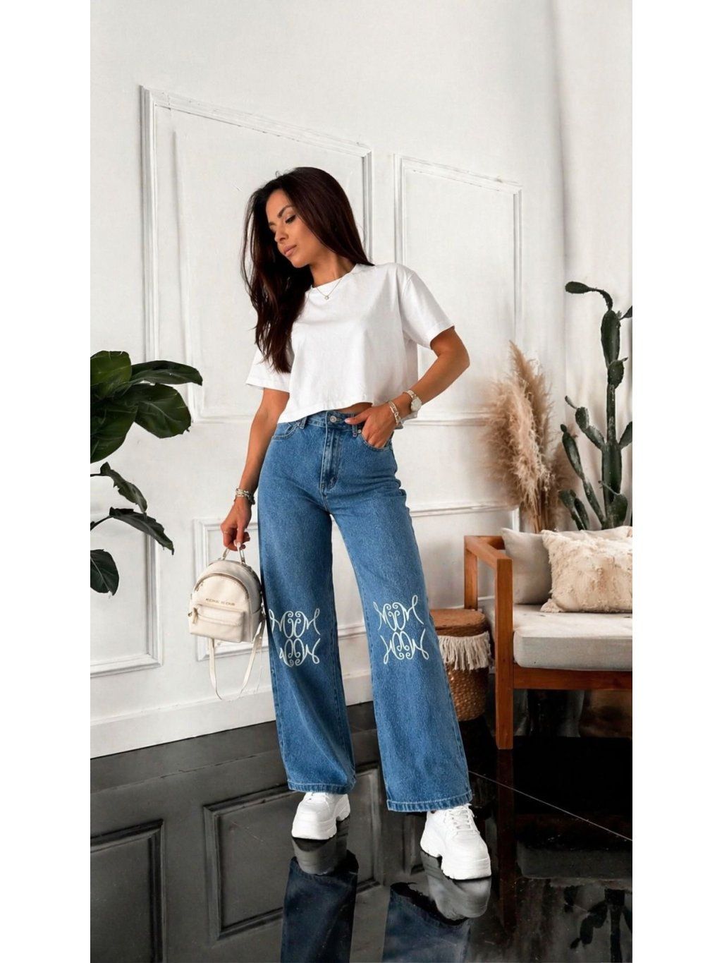 Stylové wide leg rifle, které okamžitě zaujmou originálním našitým vzorem na nohavicích. Volnější střih krásně prodlužuje nohy a zároveň zajišťuje maximální pohodlí při nošení.