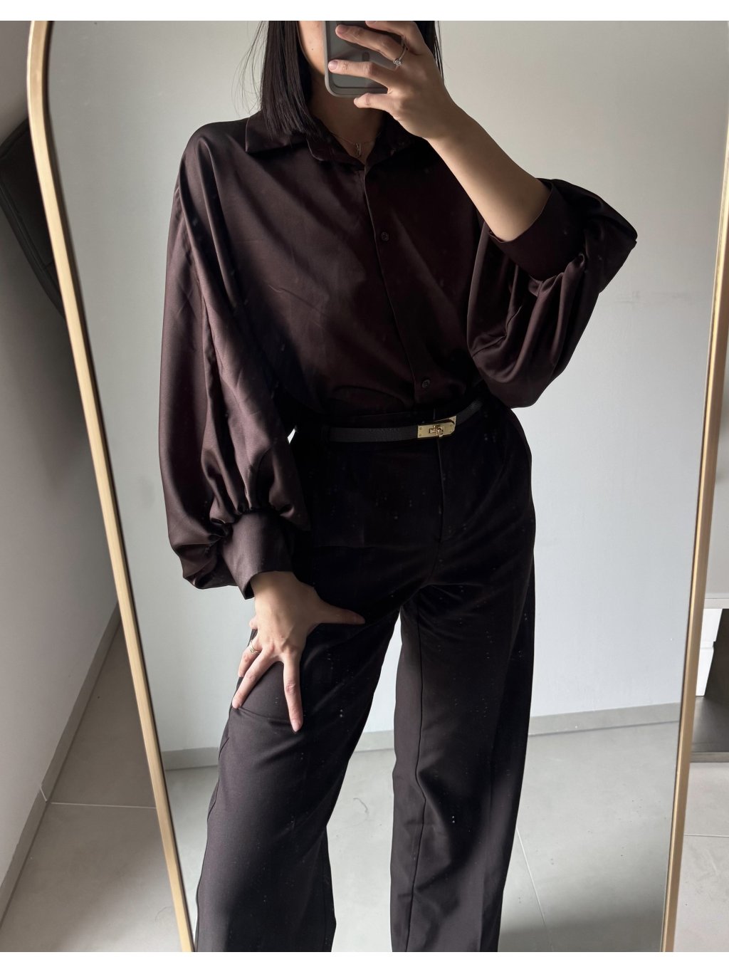 Elegantní oversize košile s výraznými balónovými rukávy, která spojuje ležérní pohodlí a luxusní vzhled. Saténově hladký materiál krásně splývá a dodává outfitu sofistikovaný šmrnc. Ideální volba pro každodenní nošení i formální příležitosti.