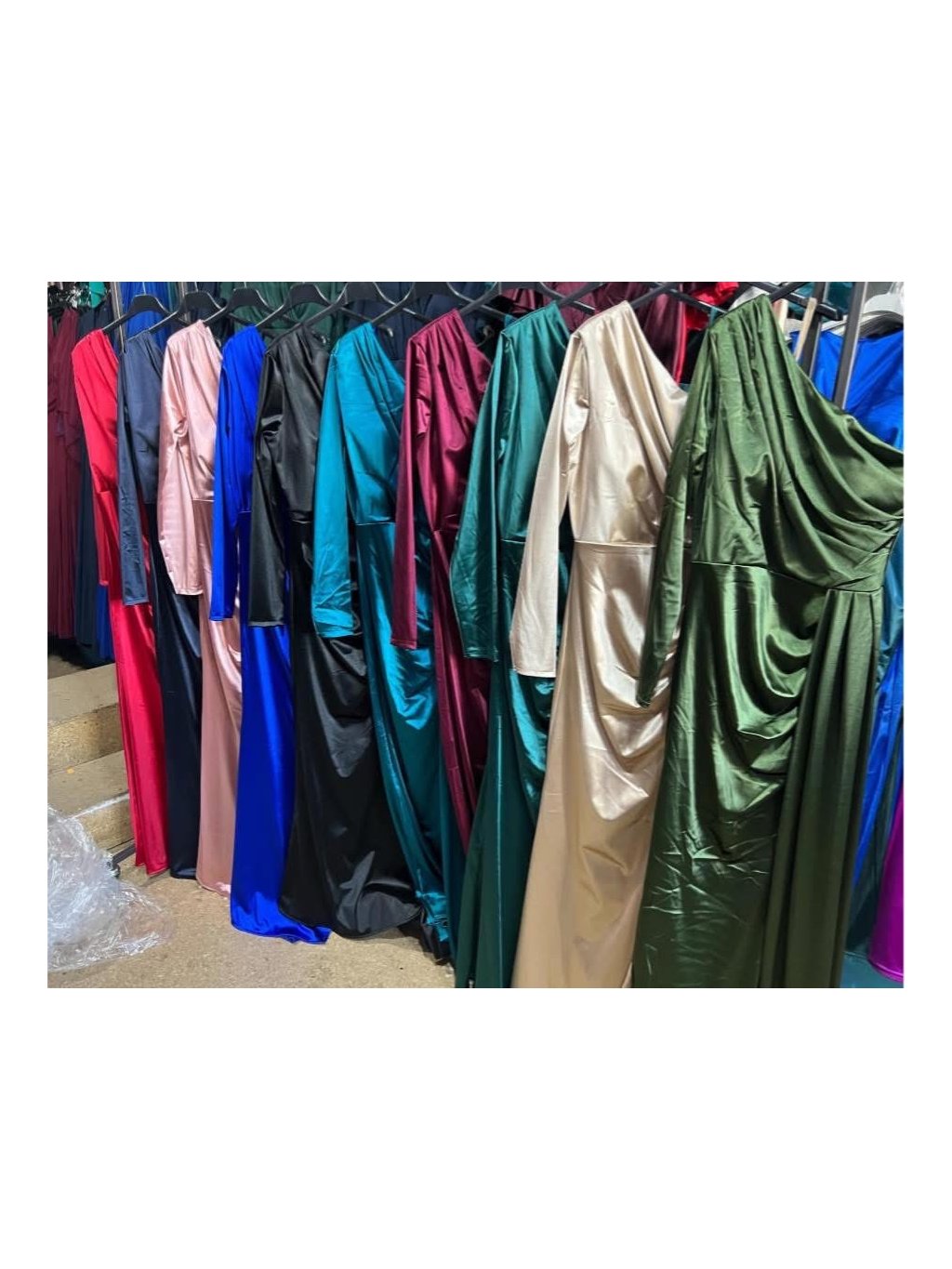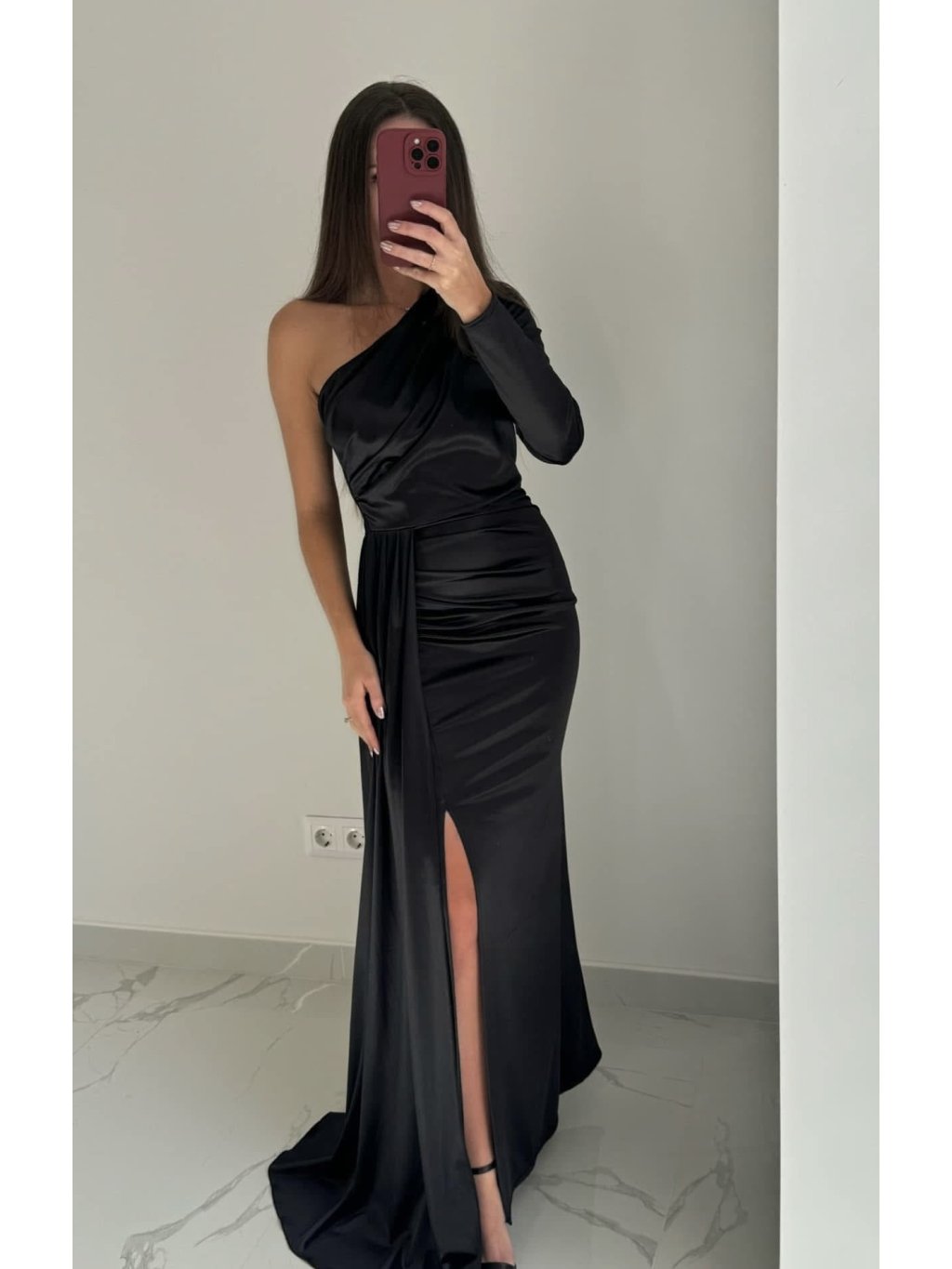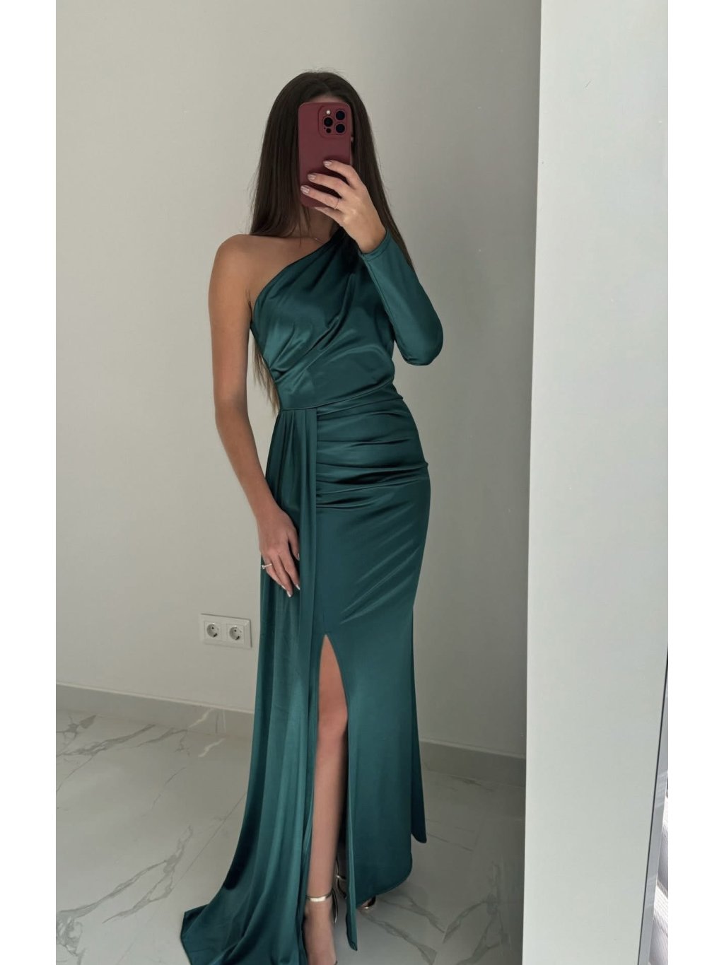 Elegantní střih s jedním rukávem působí originálně a sofistikovaně. Saténový materiál krásně odráží světlo a jemné řasení zvýrazňuje ženské křivky. Rozparek dodává šatům šmrnc a svůdnost.