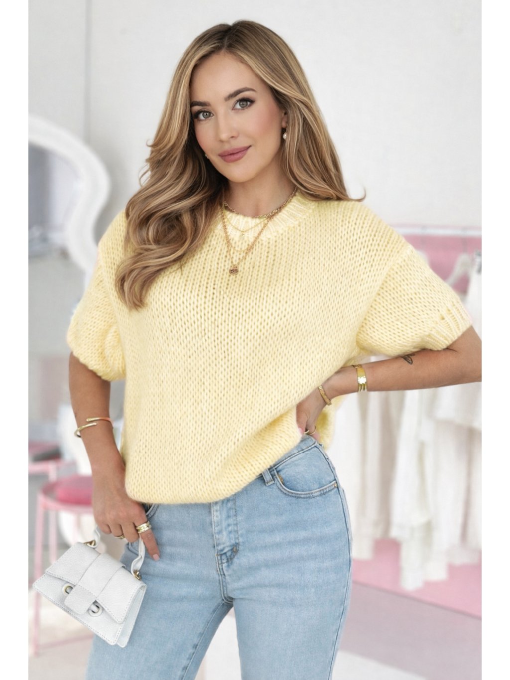 Svetr má krátký rukáv a kulatý výstřih, díky čemuž se skvěle hodí jak na běžné nošení, tak i na elegantnější kombinace. Snadno ho sladíte s džínami, sukní i kalhotami.
