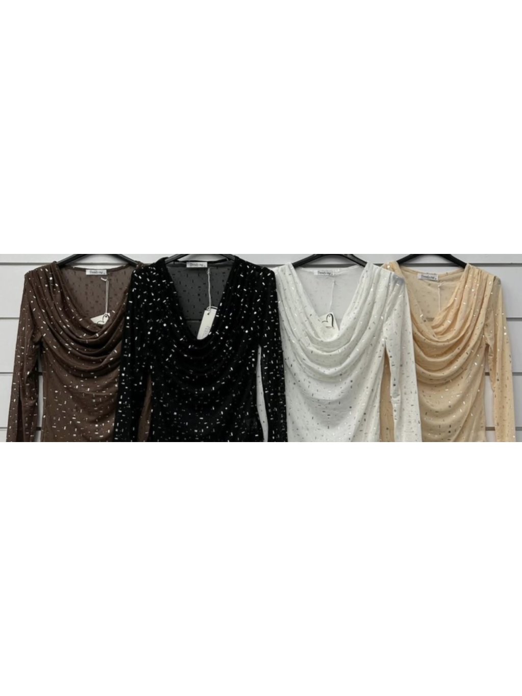 Stylový přiléhavý top z jemného tylového materiálu s vodovým výstřihem, který působí elegantně a svůdně zároveň. Díky drobným třpytivým detailům odráží světlo při každém pohybu – ideální volba pro večerní outfit, párty nebo sváteční příležitosti.